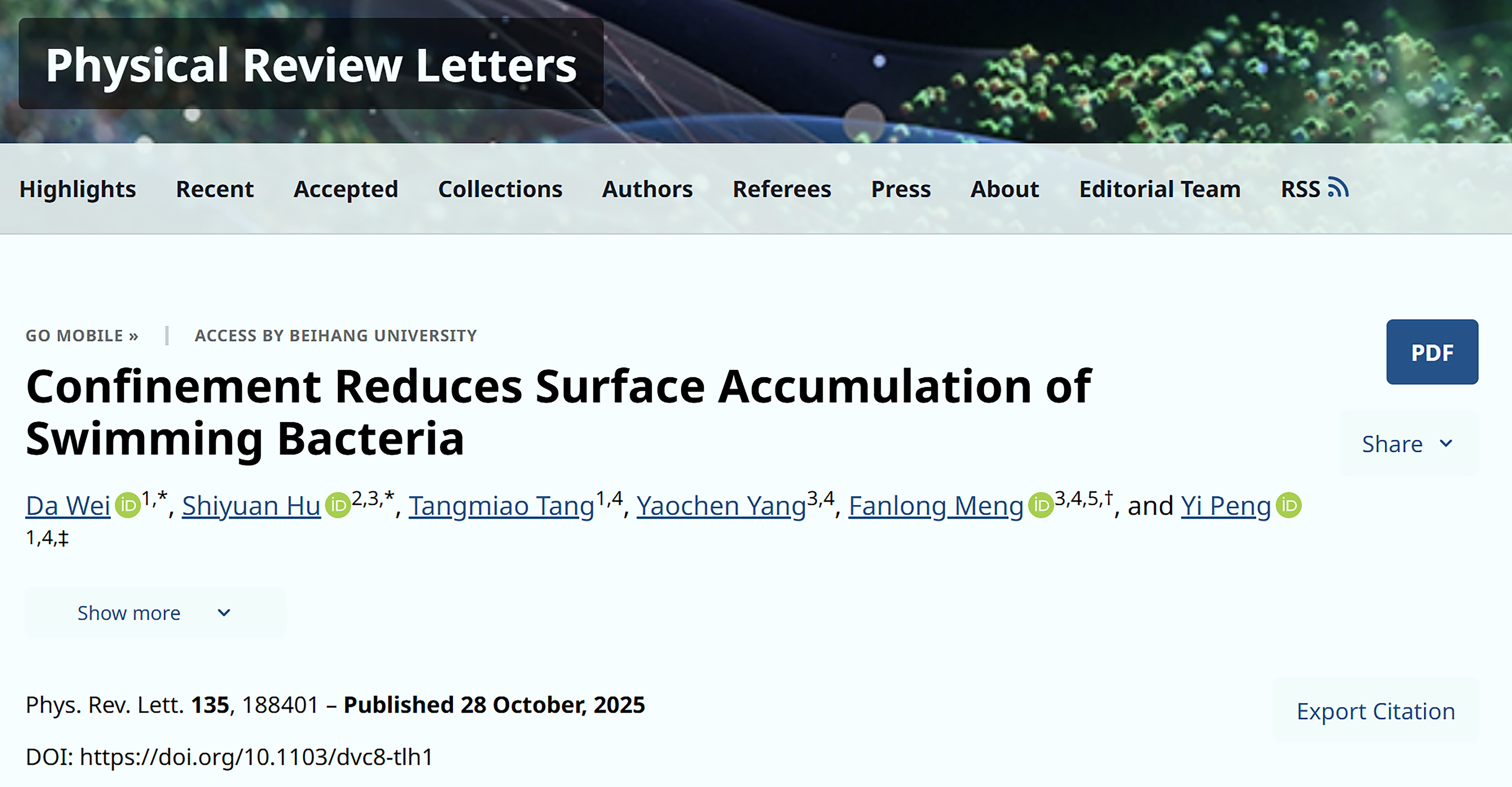 近日,北航太阳集团tyc5997胡世渊副教授与合作实验课题组在《Physical Review Letters》上发表了题为“Confinement Reduces Surface Accumulation of Swimming Bacteria”的论文。
